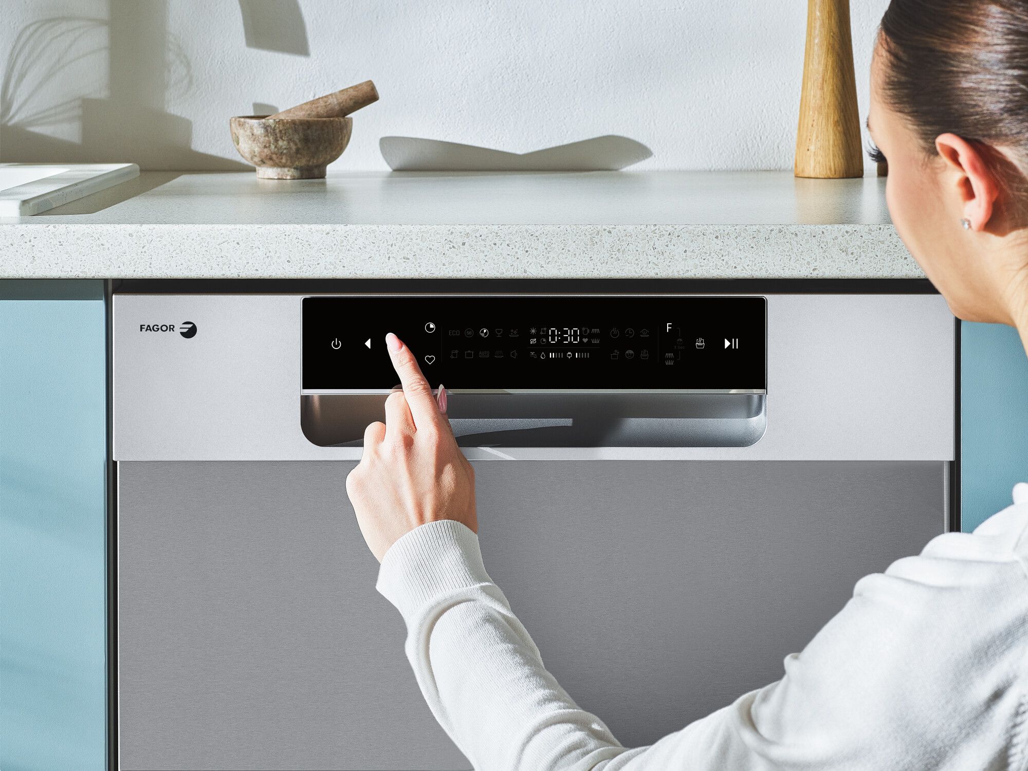 En el display táctil del lavavajillas de la gama ShineWash, Fagor Electrodoméstico incorpora el indicador EcoBar, de manera que los usuarios pueden controlar tanto el consumo de energía como de agua de cada ciclo de lavado, permitiéndoles controlar cada ciclo y ajustarlo a sus necesidades. «Según las circunstancias en las que nos encontremos, a veces priorizamos un ciclo de limpieza que consuma poco o, si tenemos más prisa, recurrimos a programas que son más cortos pero consumen más. En este sentido, le damos el control al usuario para que en todo momento optimice los lavados según las necesidades que tenga en ese momento», señala Esther Rioboo, directora de producto de la firma.
