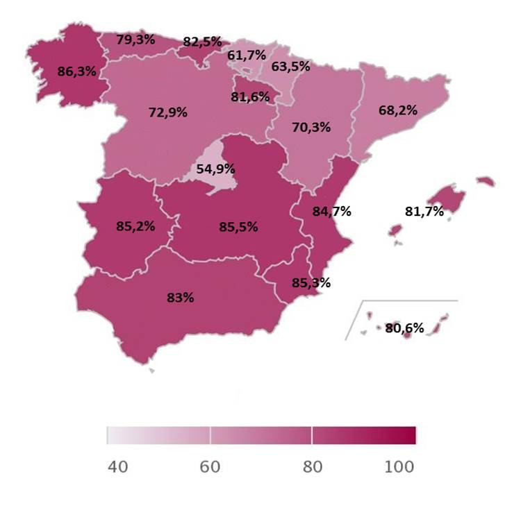 Llama la atención que Madrid y Cataluña, con un 54,9 por ciento y un 68,2 por ciento respectivamente, sean las dos autonomías que menos puestos de trabajo generaron, lo que tiene su razonamiento en que son las regiones con mayor presencia de multinacionales. A ellas se suman País Vasco (61,7 por ciento) y Navarra (63,5 por ciento), en la que «el régimen fiscal especial habría resultado determinante». En el otro lado de la tabla, Galicia (86,3 por ciento), Castilla y León (85,5 por ciento) y Murcia (85,3 por ciento).